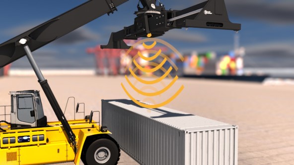 El sensor con un rango de 3 metros asegura la distancia mínima con dos rangos de conmutación independientes y reduce la velocidad de acercamiento por debajo de un valor umbral especificado a un nivel seguro. Esto permite al conductor agarrar y cargar contenedores de forma rápida y segura.